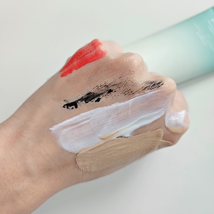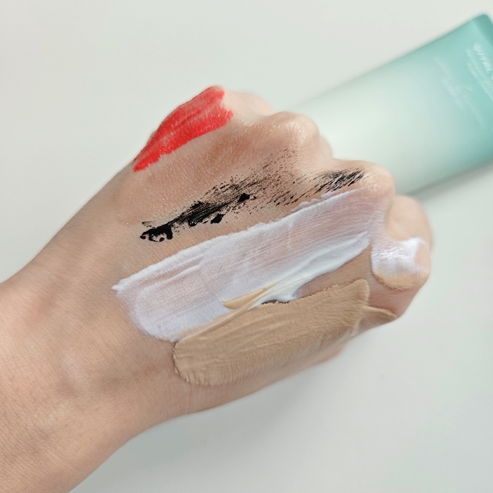 재정력 부분을 보여드리기 위해서 제가 평소에 사용하는 화장품을 손등 위에 발라보았습니다. 여기에는 립 제품은 물론이고 펄이 들어간 화장품과, 마스카라와 크림, 파운데이션이 있습니다.